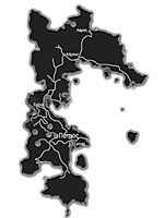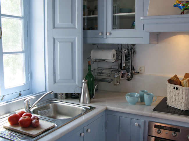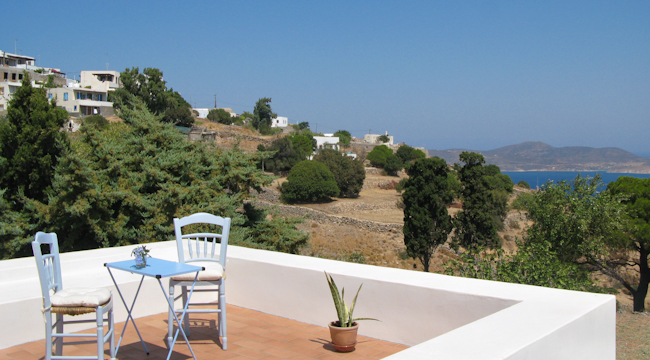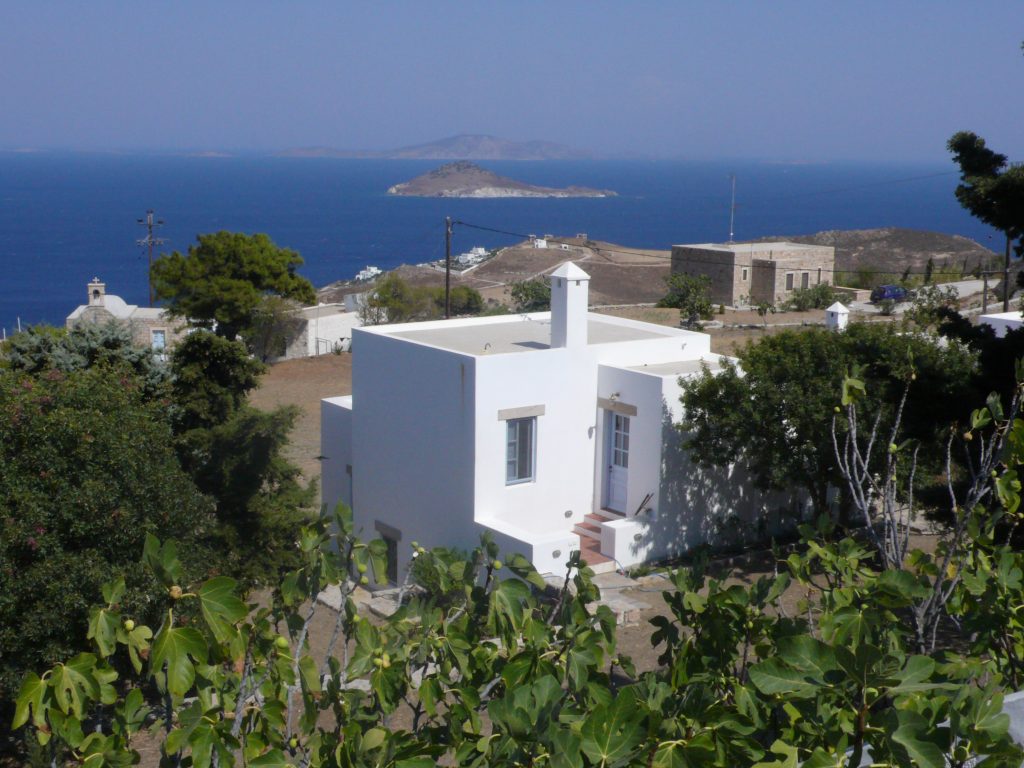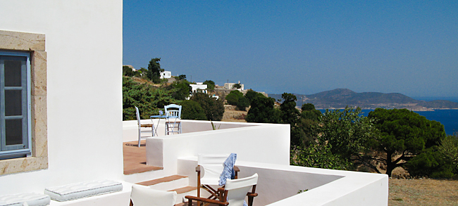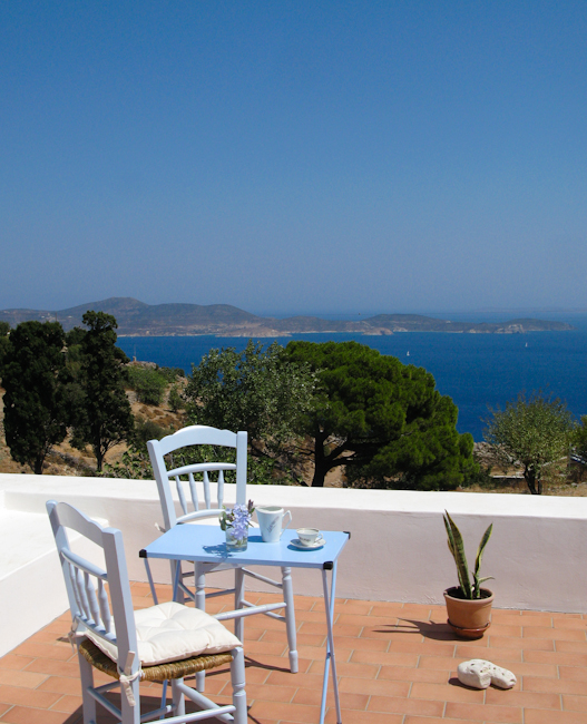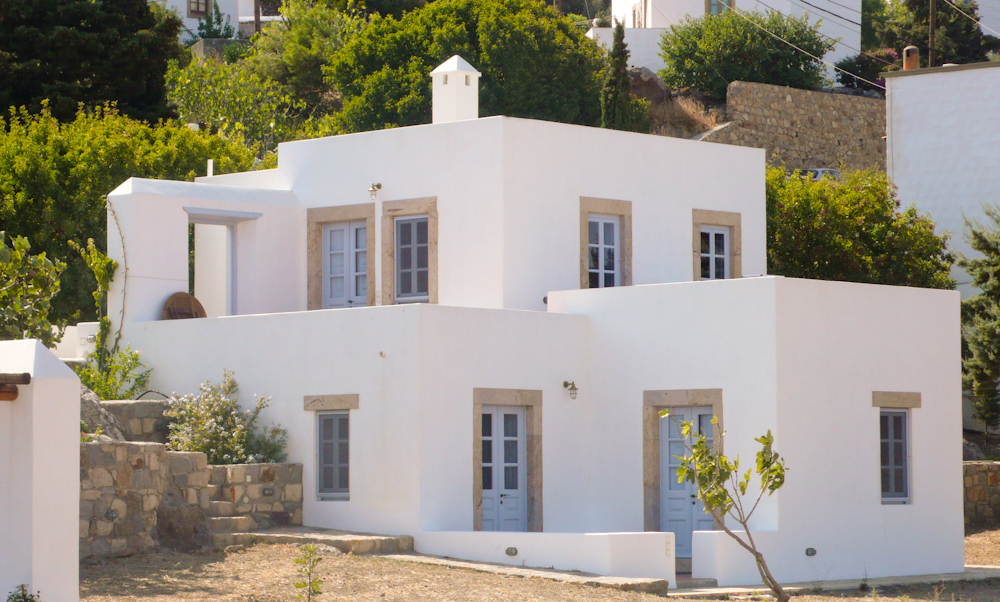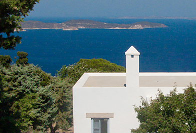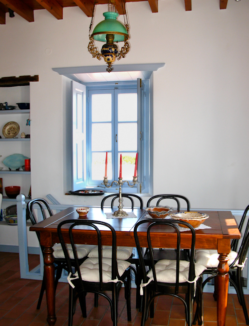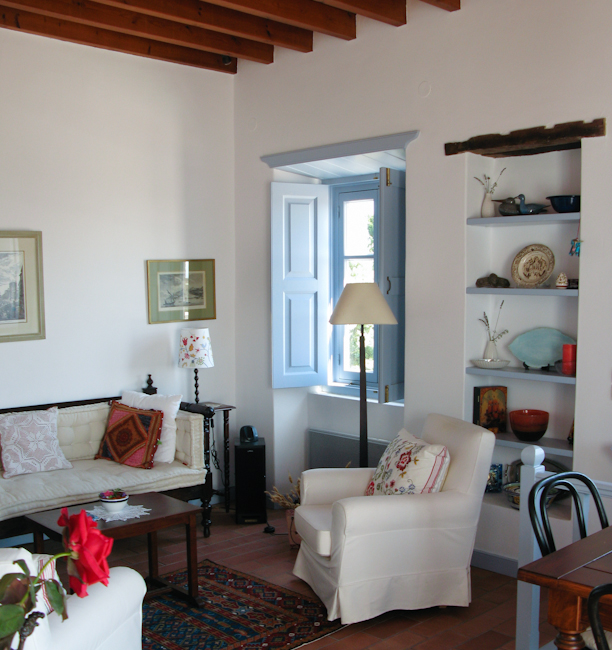 Living/dining room with traditional Patmian sofa, open fireplace,TV, hi-fi stereo.